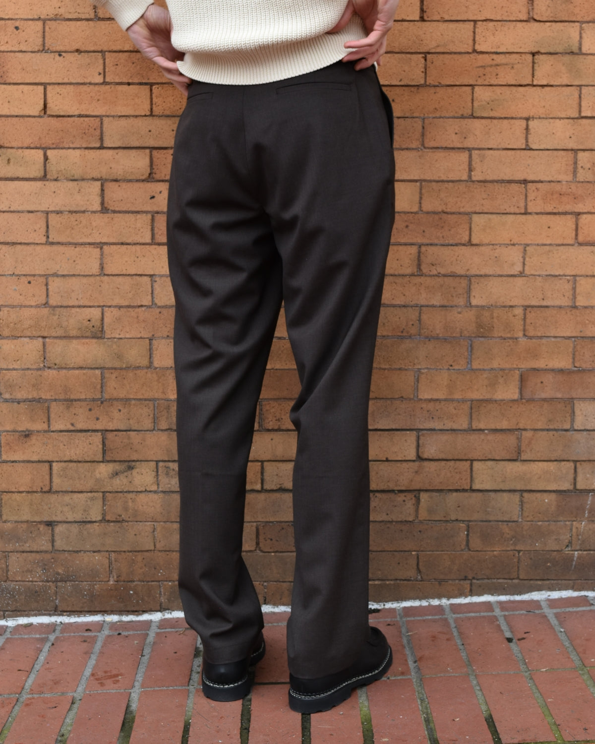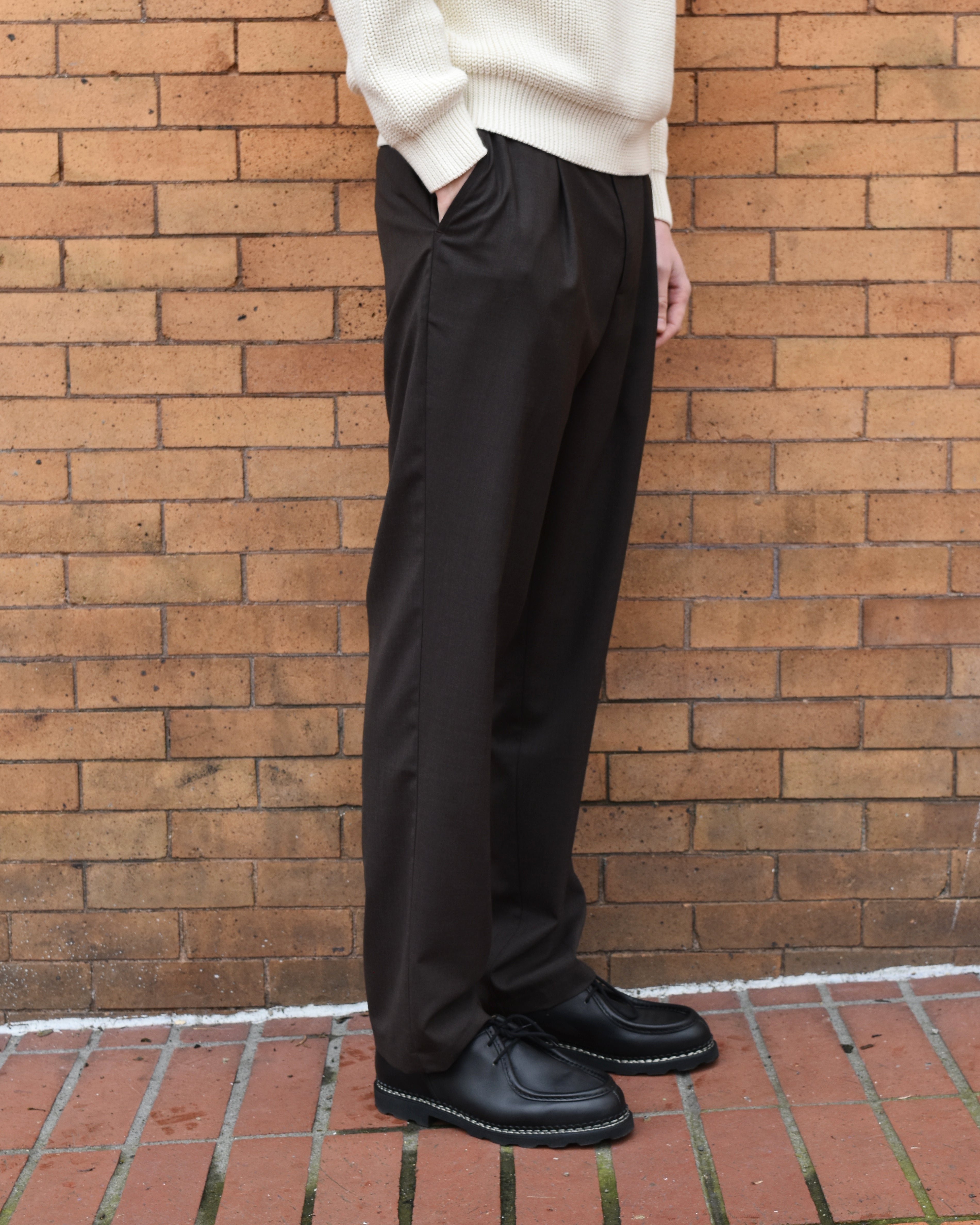 Cut from Italian-woven Super 130’s cold wool in a rich bark brown, the fabric offers warmth and a soft, elevated hand. Crafted in France with meticulous attention to fit and finish, these trousers are a quintessential piece for both polished and everyday looks.