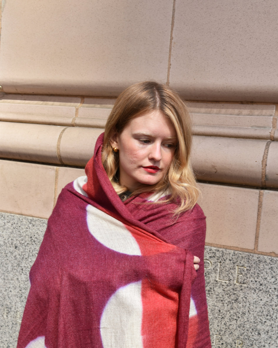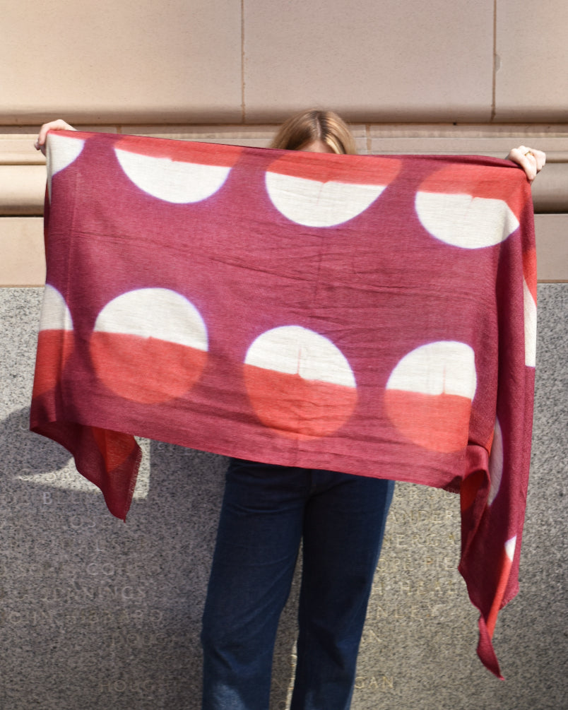 This scarf from Denovembre is a hand-dyed merino wool shawl in deep burgundy and bright red hues.