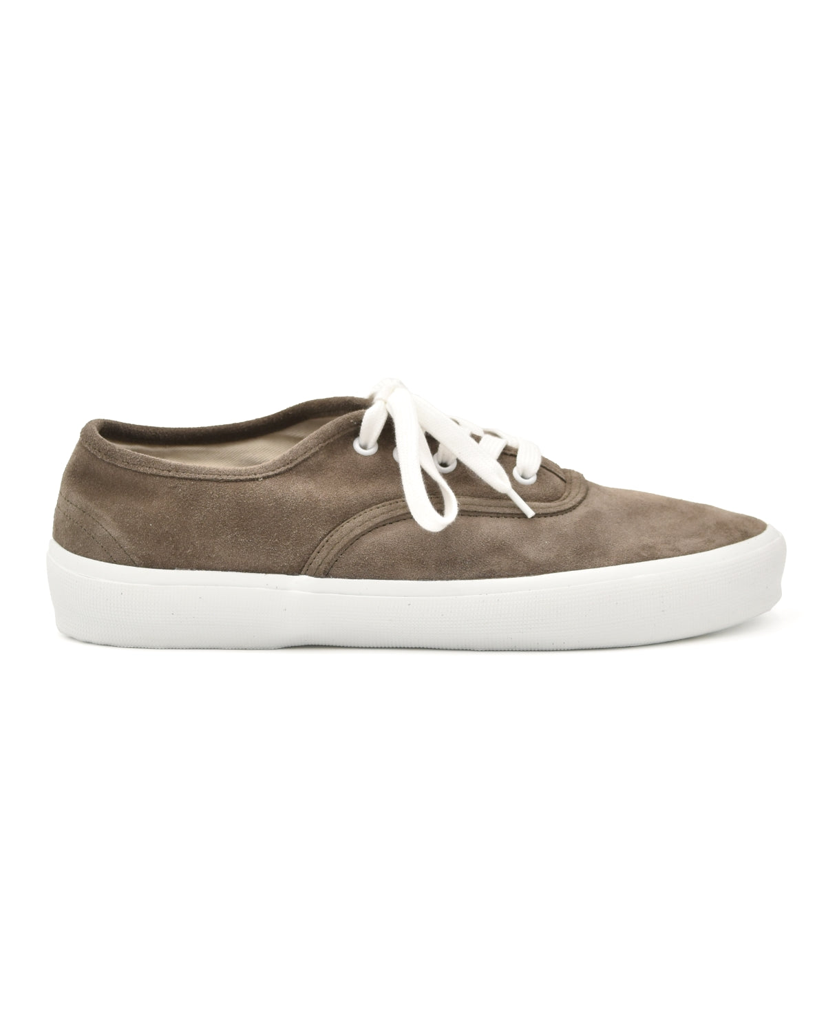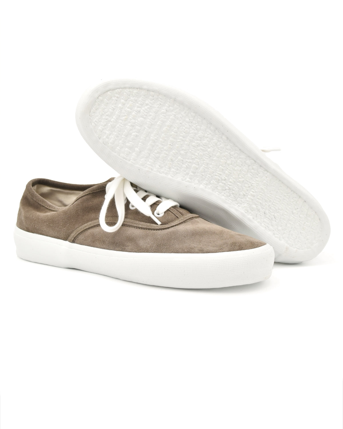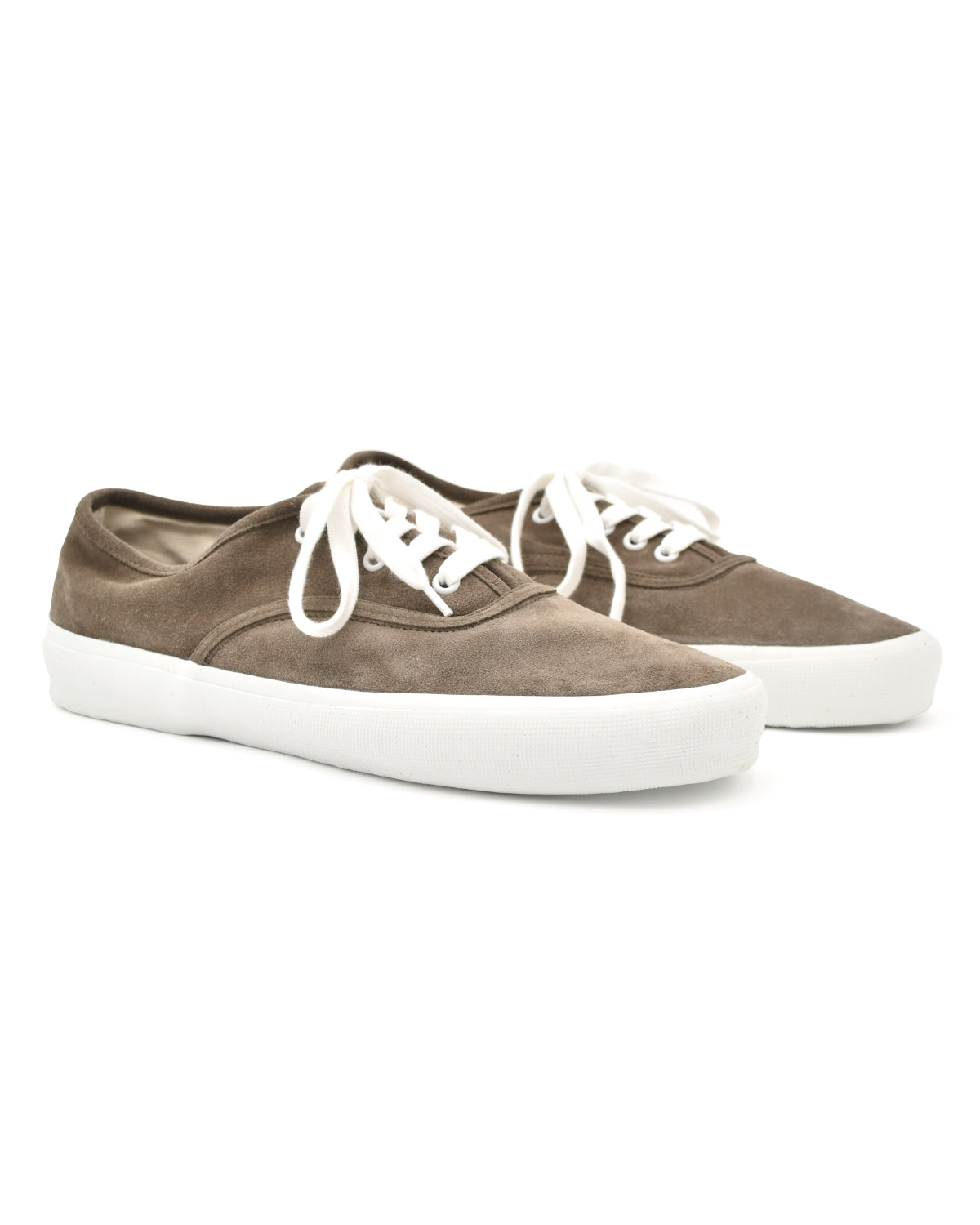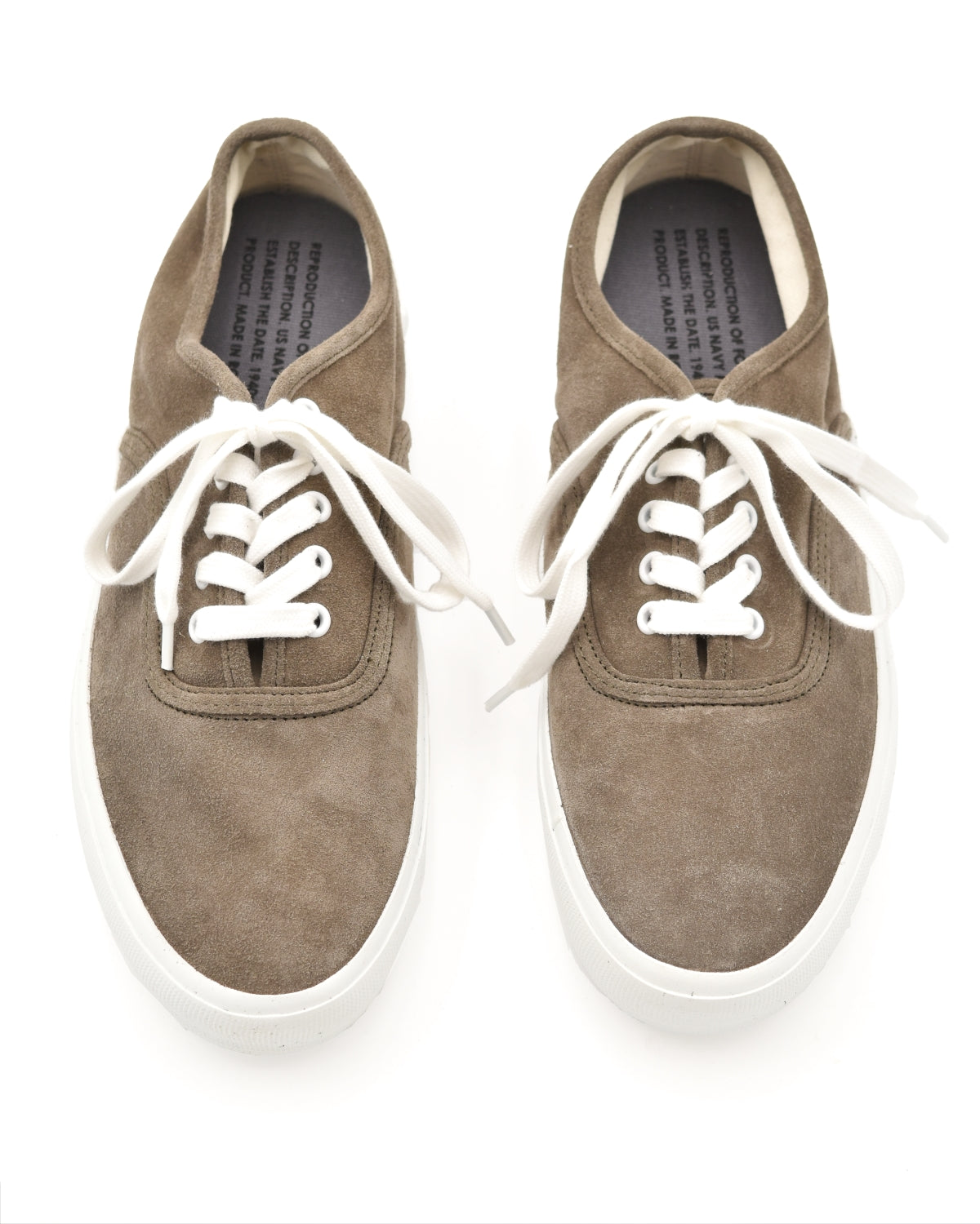 From Reproduction of Found, this sneaker is a faithful reinterpretation of 1940s U.S. Navy training shoes, blending archival military design with modern craftsmanship. The upper is executed in olive suede for a more elevated, tactile feel, while the original deck-ready rubber outsole pattern is preserved for reliable grip and durability.