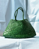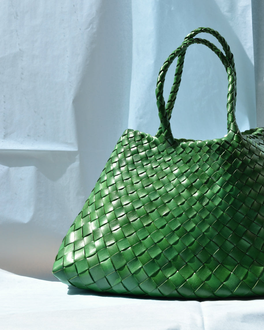 The Santa Croce from Dragon Diffusion is a woven leather handbag in a vibrant green hue.The bag is constructed of irregularly cut strips of leather to create the variated weave pattern.