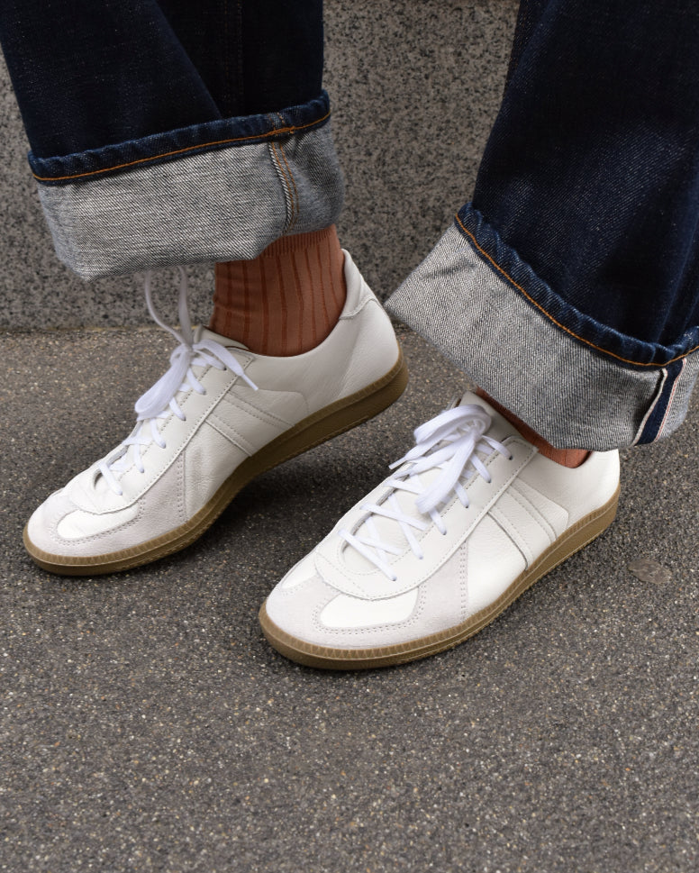 The iconic GAT sneaker from Reproduction of Found is a 1700L German Military Trainer painstakingly recreated by the brand down to the last detail. The main distinction from the original sneaker is the material choices. In this modern edition, you will find premium Italian leather and suede detailing and an exceptionally comfortable leather insole.