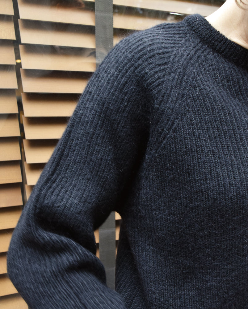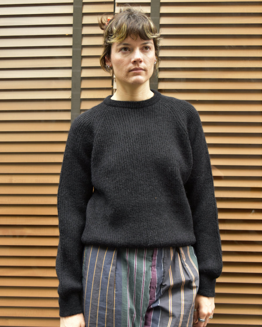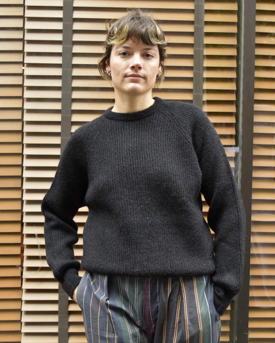 This roundneck sweater from Denobiliary Particle is a mohair blend crewneck in black. The English rib sweater is a classic fit that is 100% knitted and finished by hand in Italy.