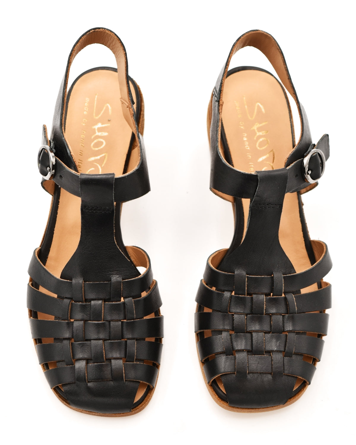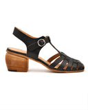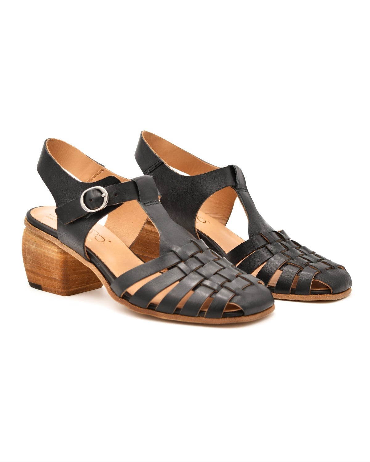 This woven heeled sandal from Shoto is a seasonal favorite. It features a woven leather fisherman-style toe, paired with a 1.5-inch stacked heel finished with a beveled top edge and an adjustable buckle closure.