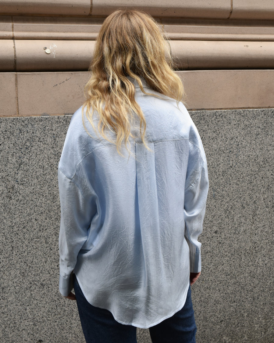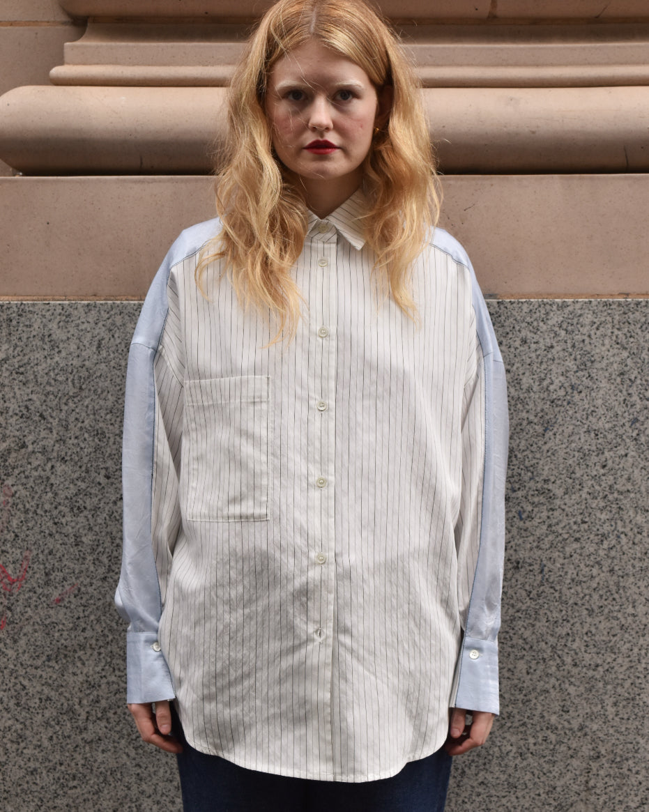 The Nora from Tela is a two-toned button up shirt with a striped front and sky blue back. Features a front pocket and contrast black stitching with loose threads at the cuffs.